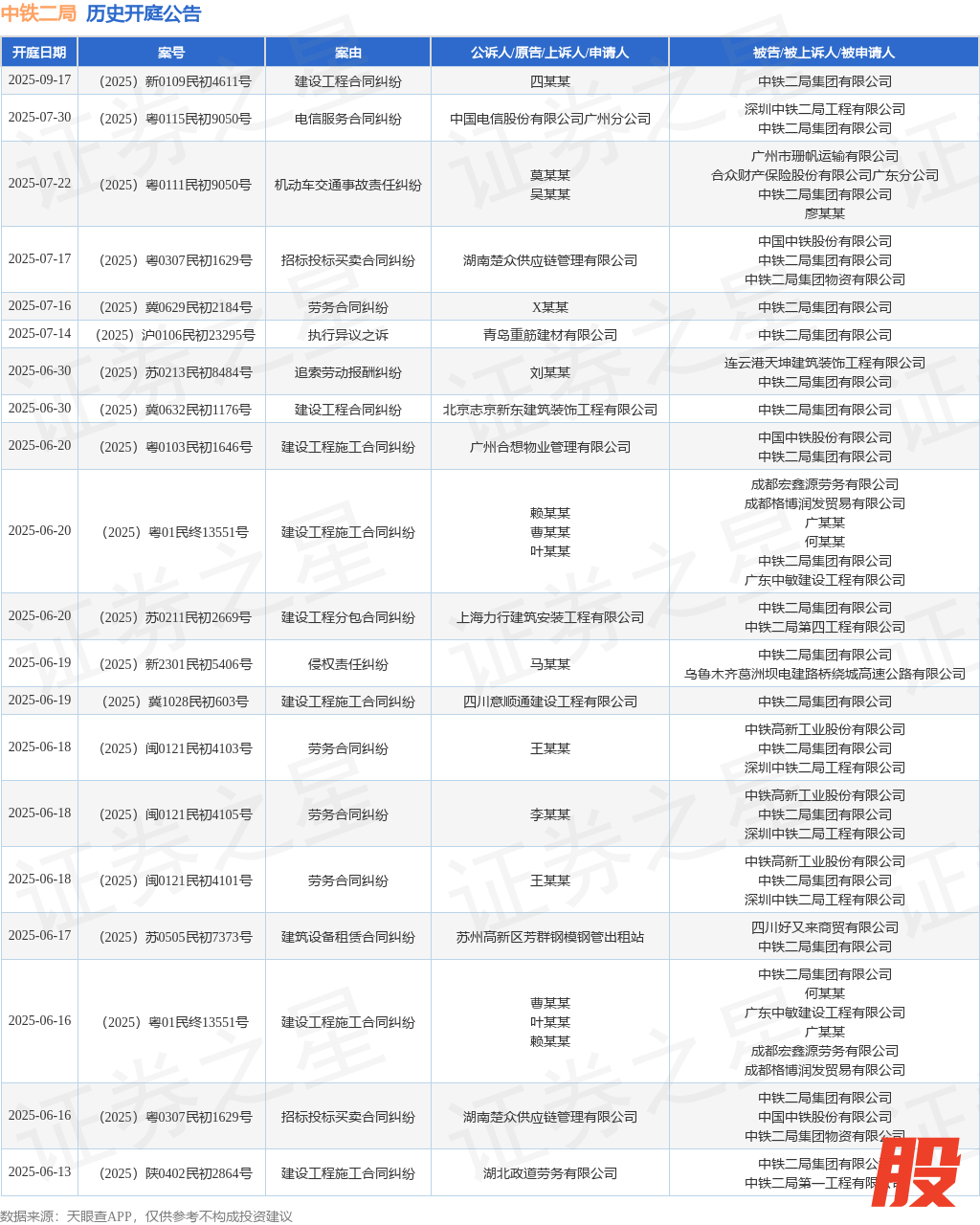 本站消息,根据天眼查APP显示万德资本,近日公布了一则中铁二局集团有限公司作为被告/被上诉人的开庭公告,详细内容如下: